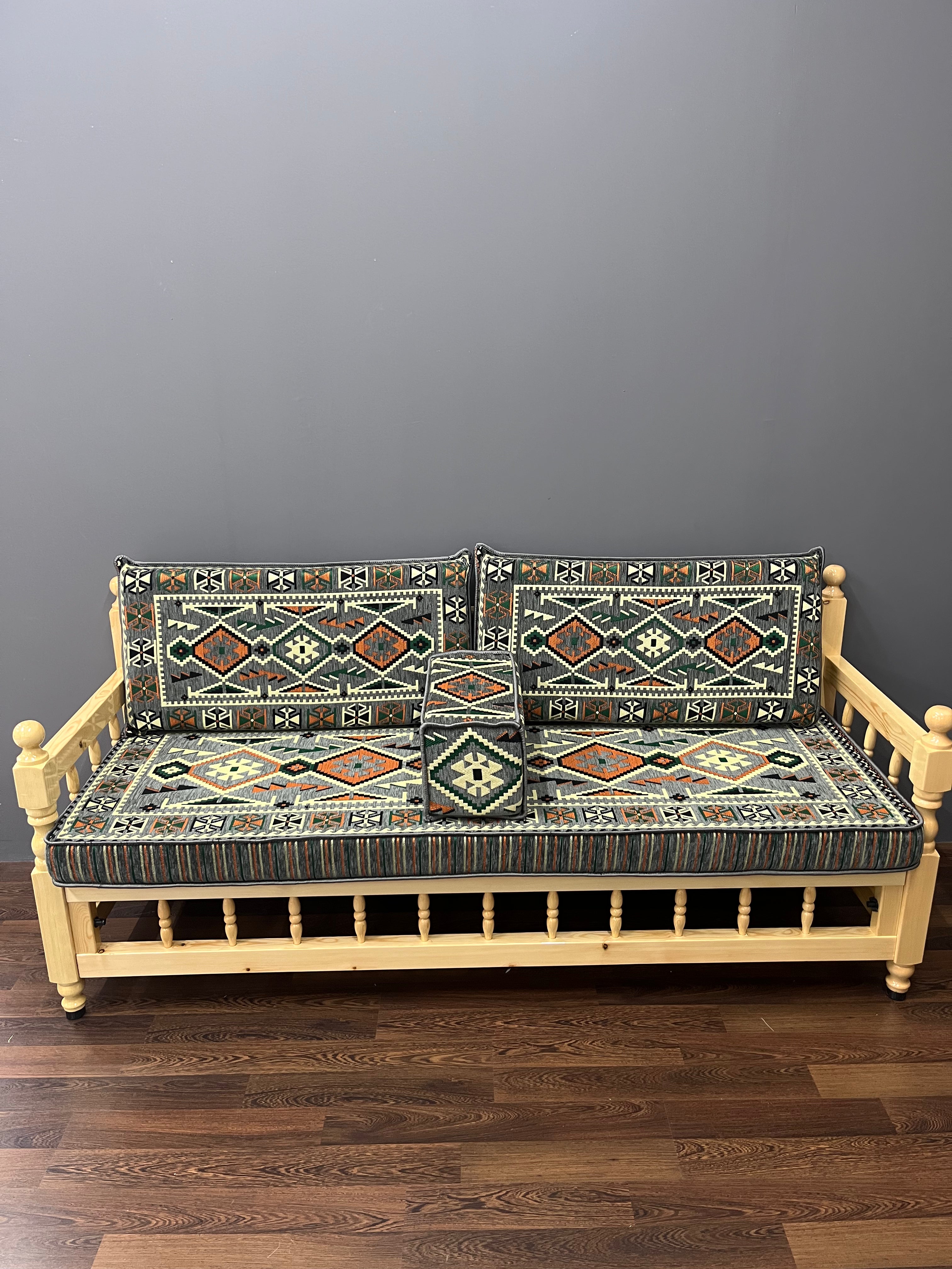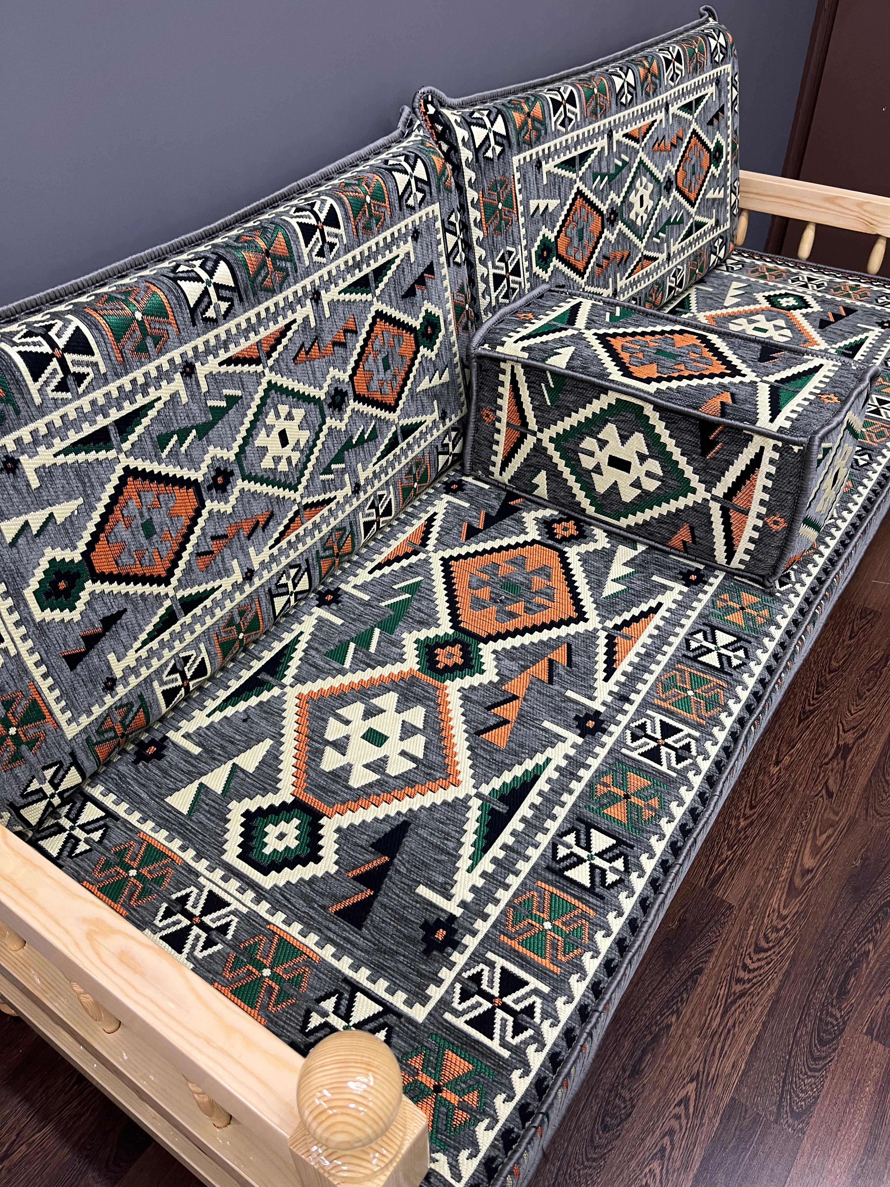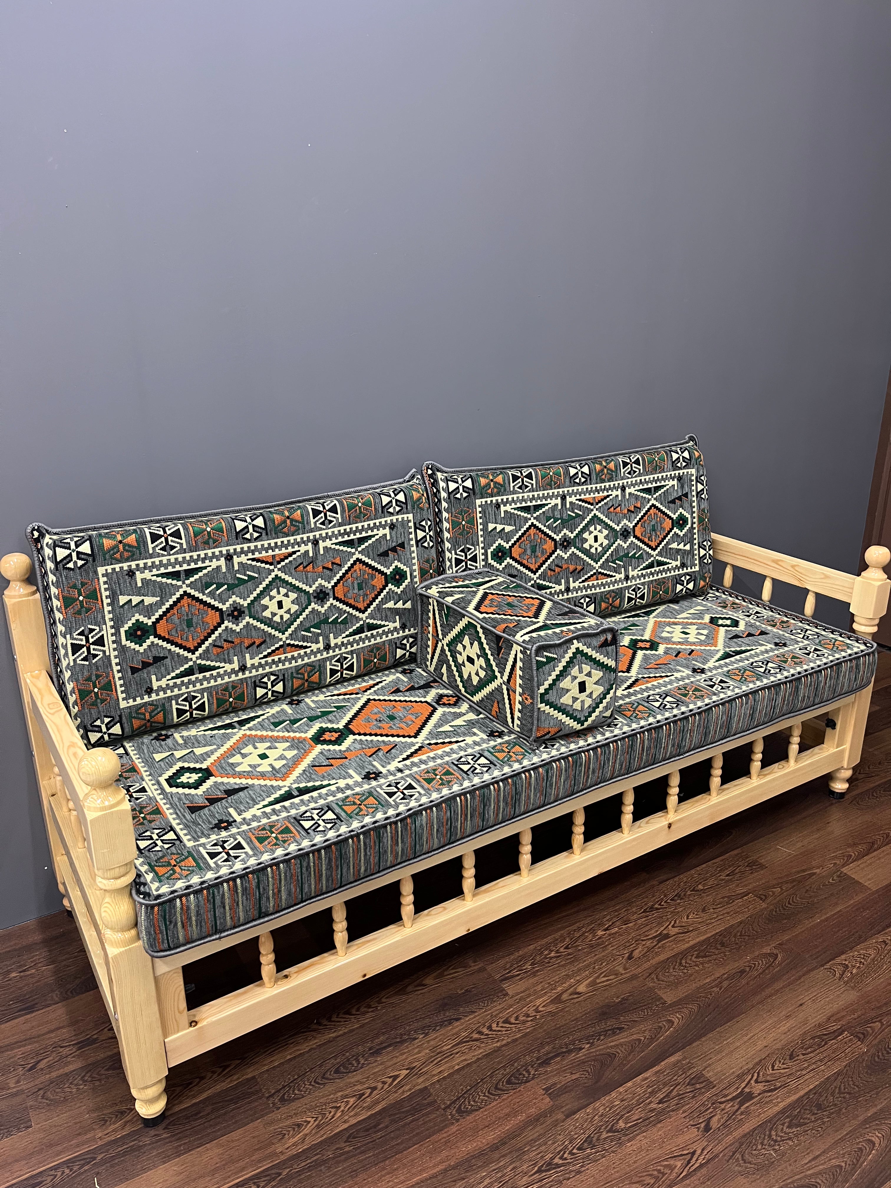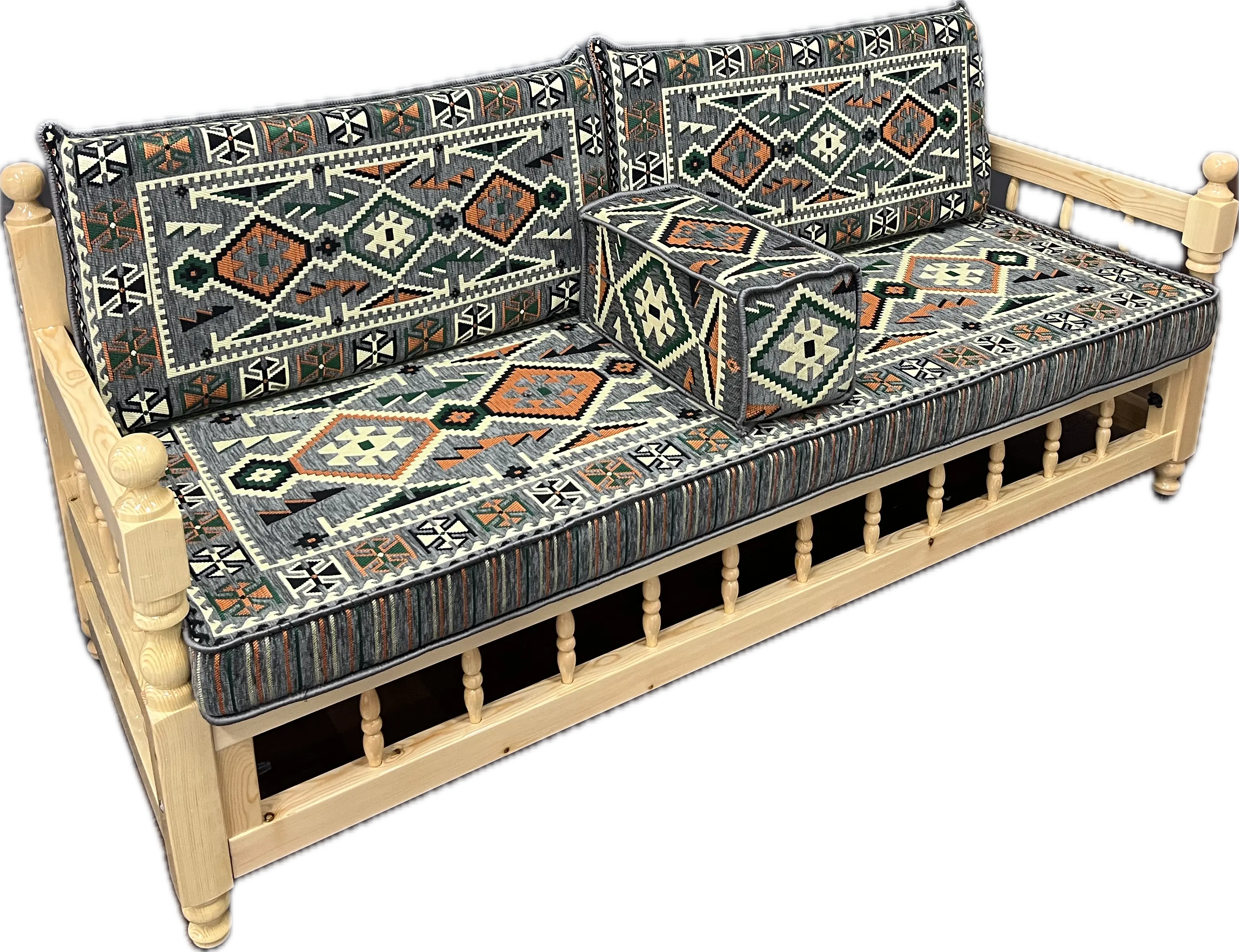 Avec ses motifs géométriques gris et ses finitions soignées, cet ensemble est idéal pour créer un coin salon chaleureux, un espace détente convivial ou un décor oriental moderne.