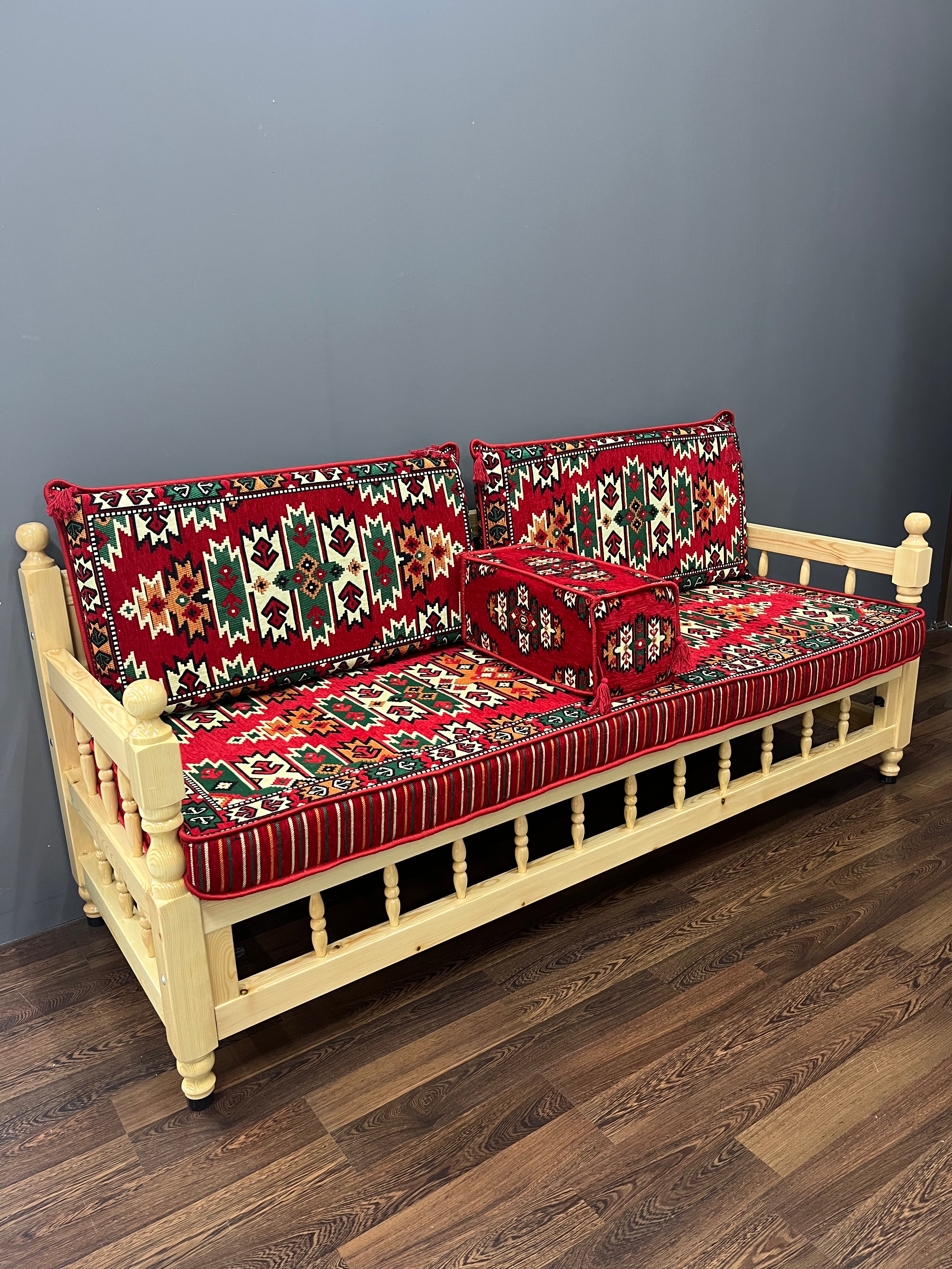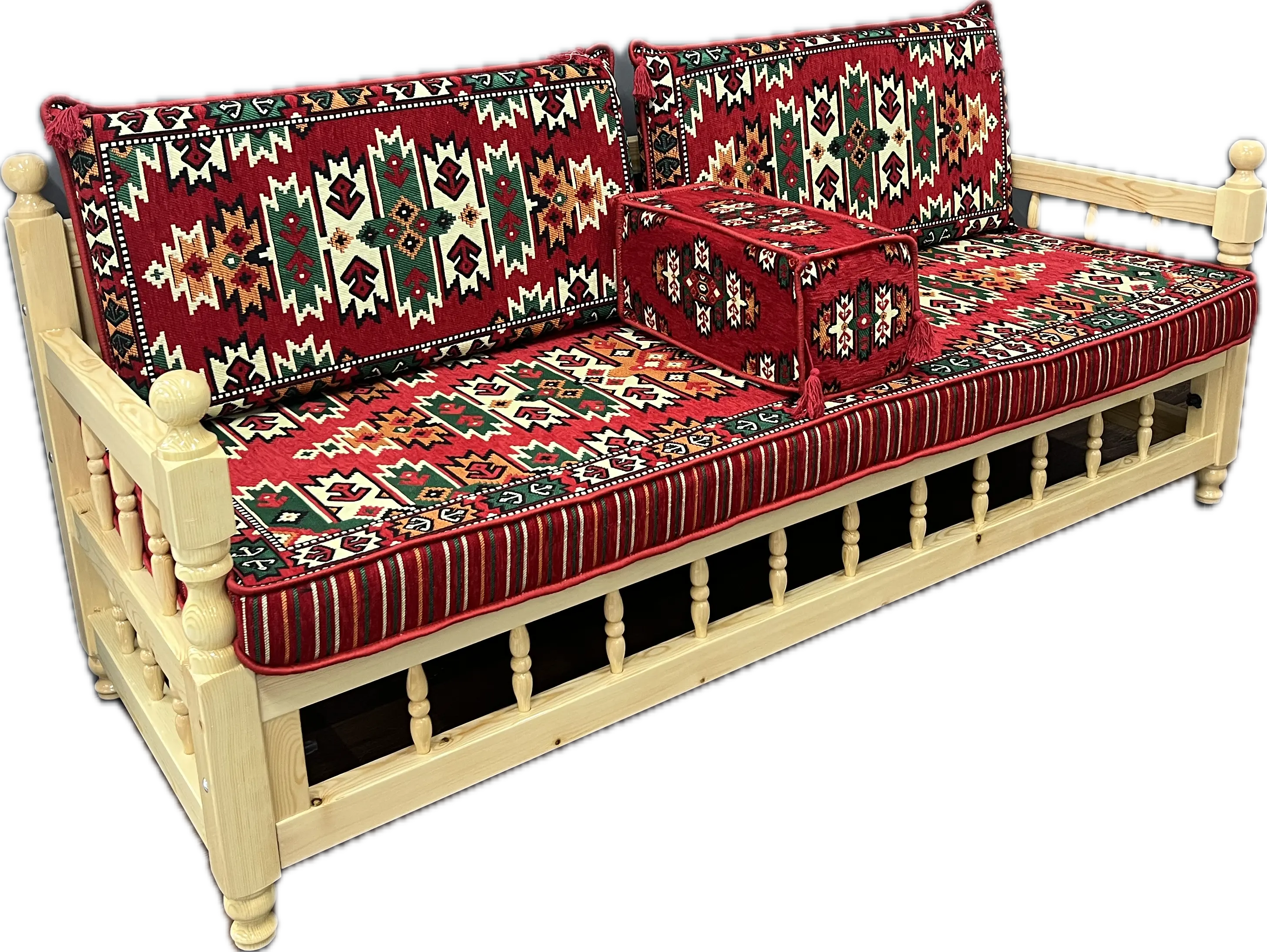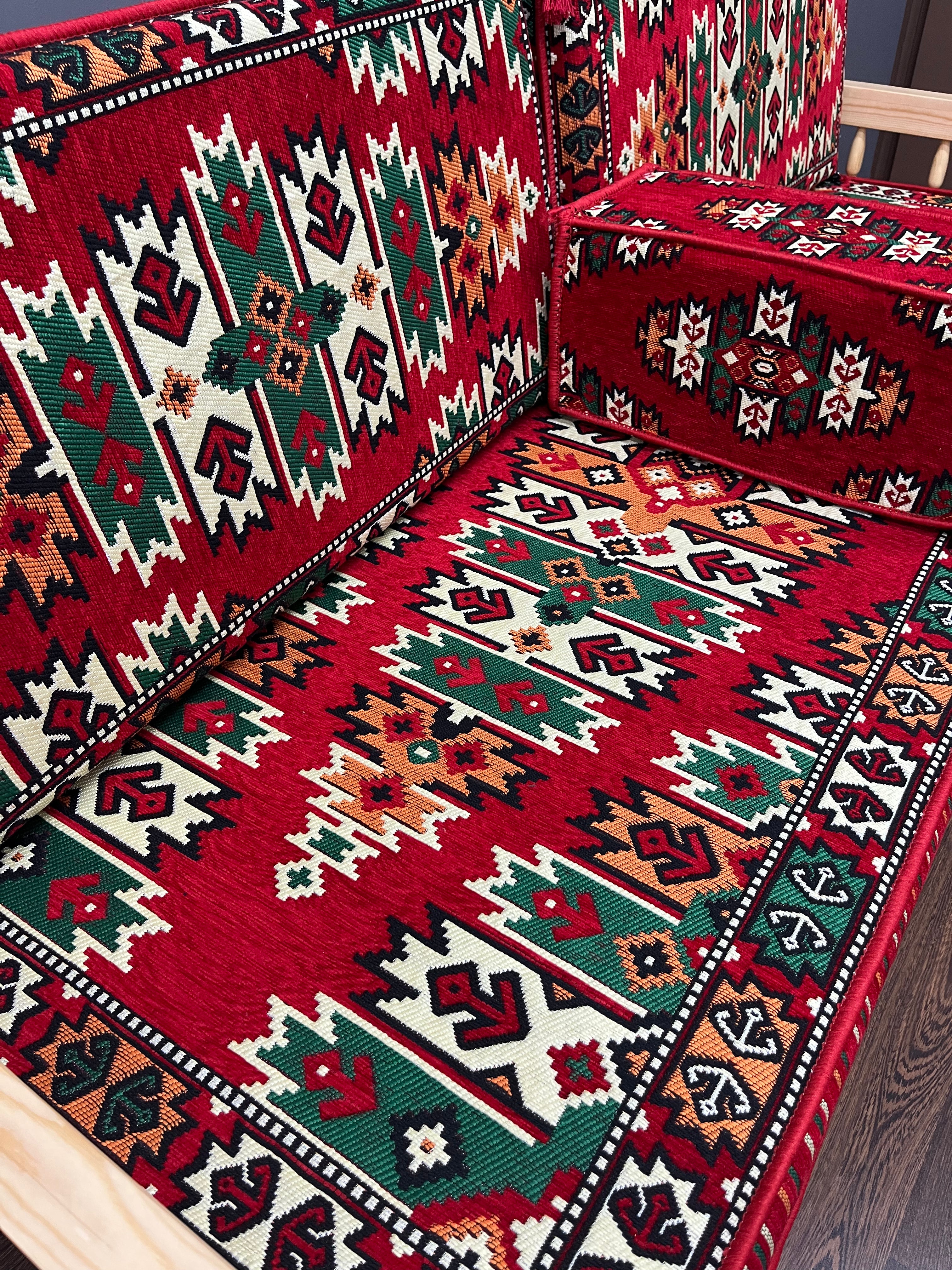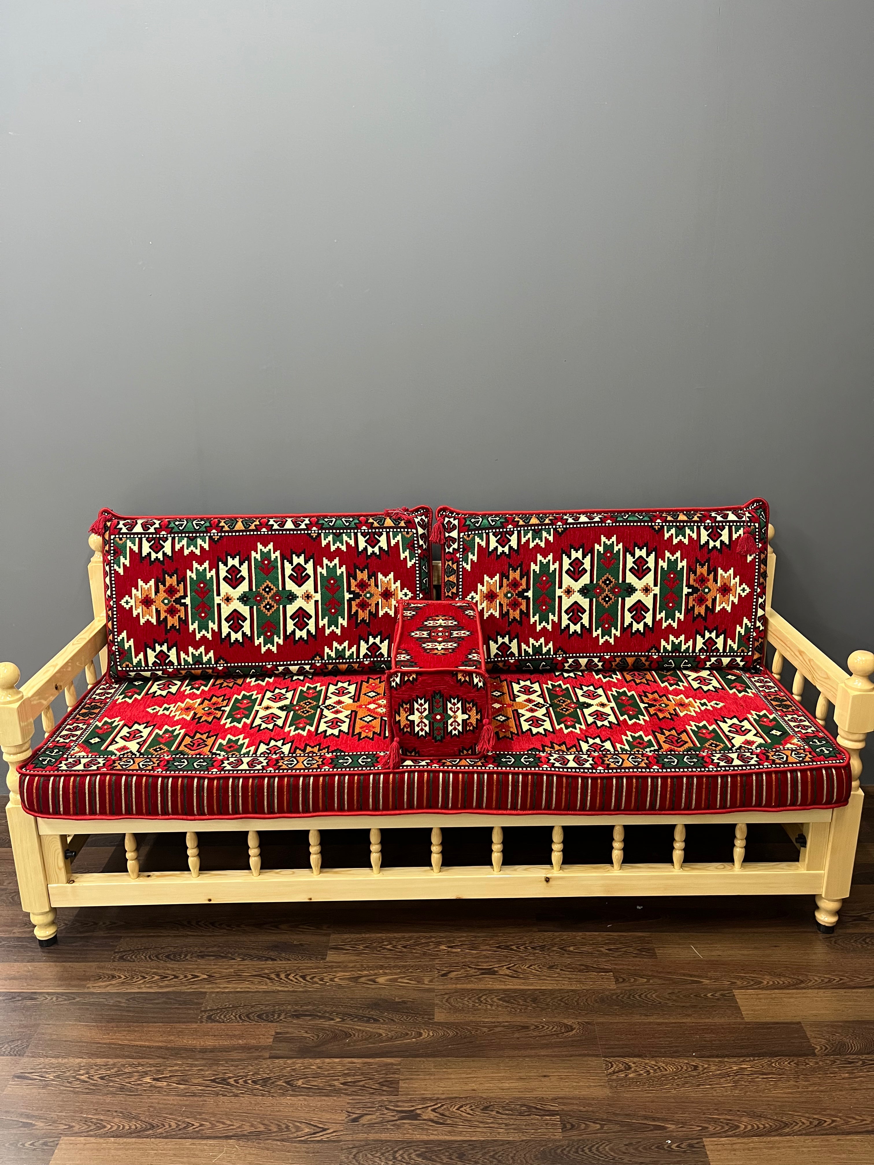 Avec ses motifs géométriques rouge et ses finitions soignées, cet ensemble est idéal pour créer un coin salon chaleureux, un espace détente convivial ou un décor oriental moderne.