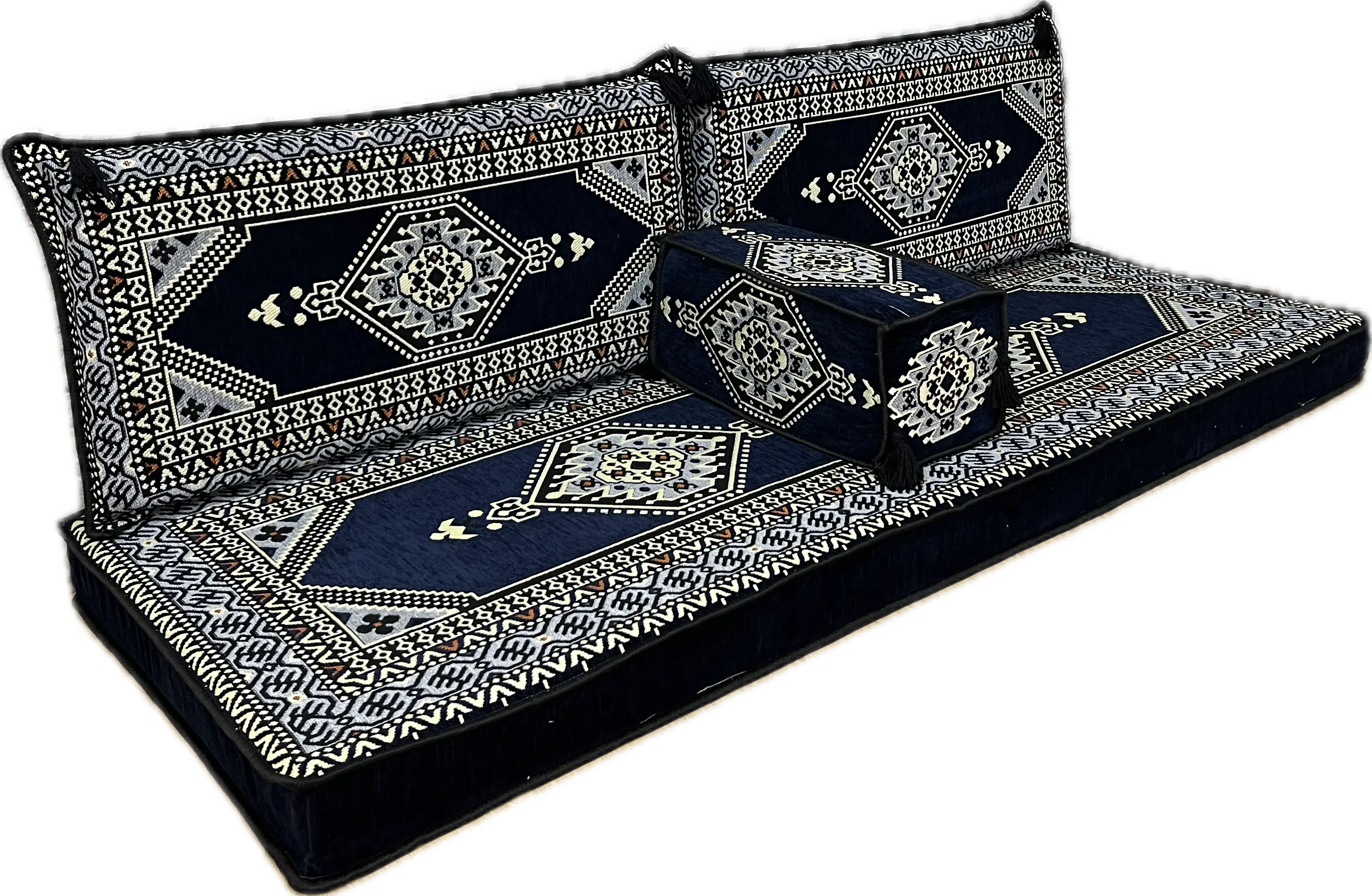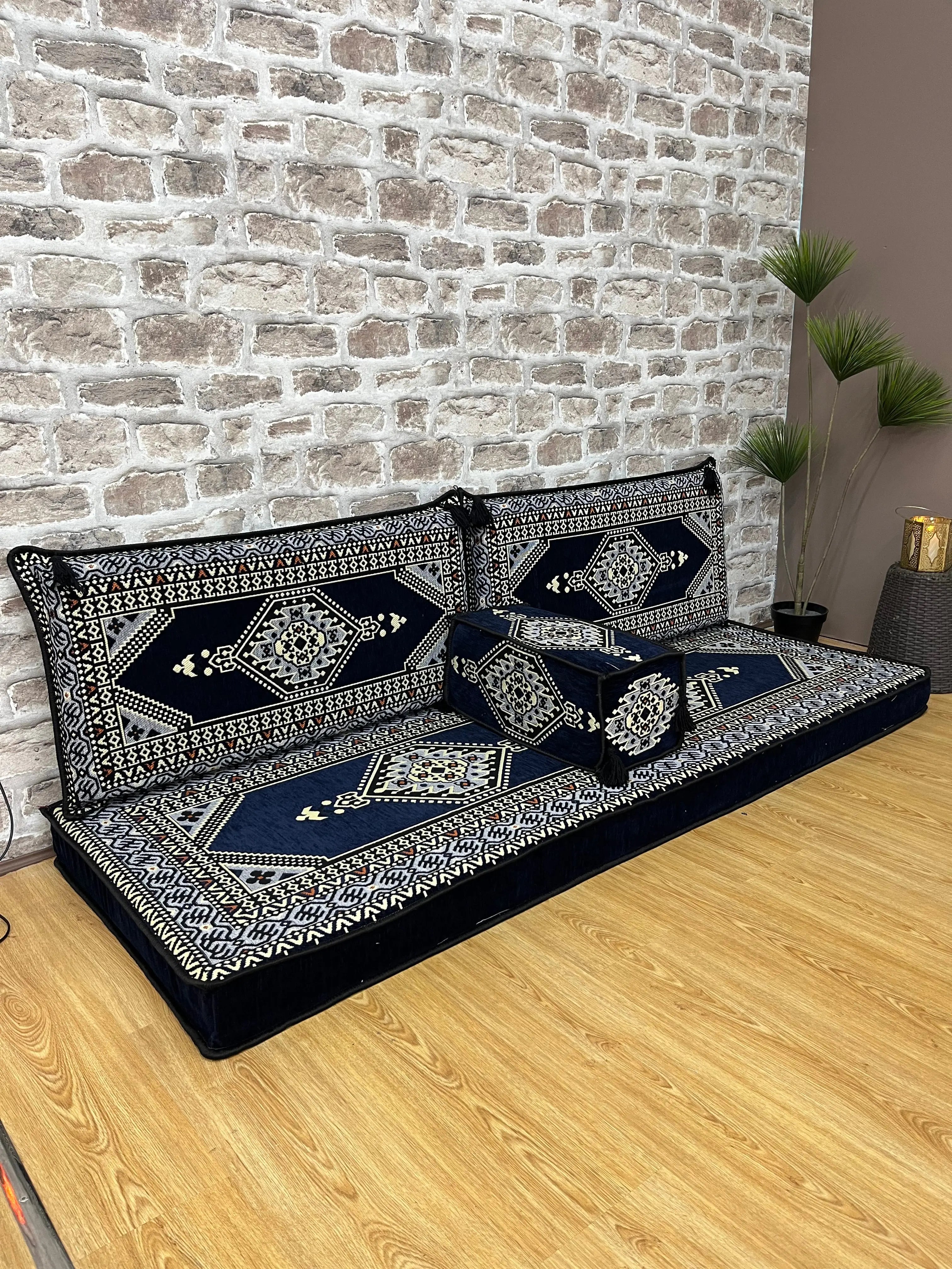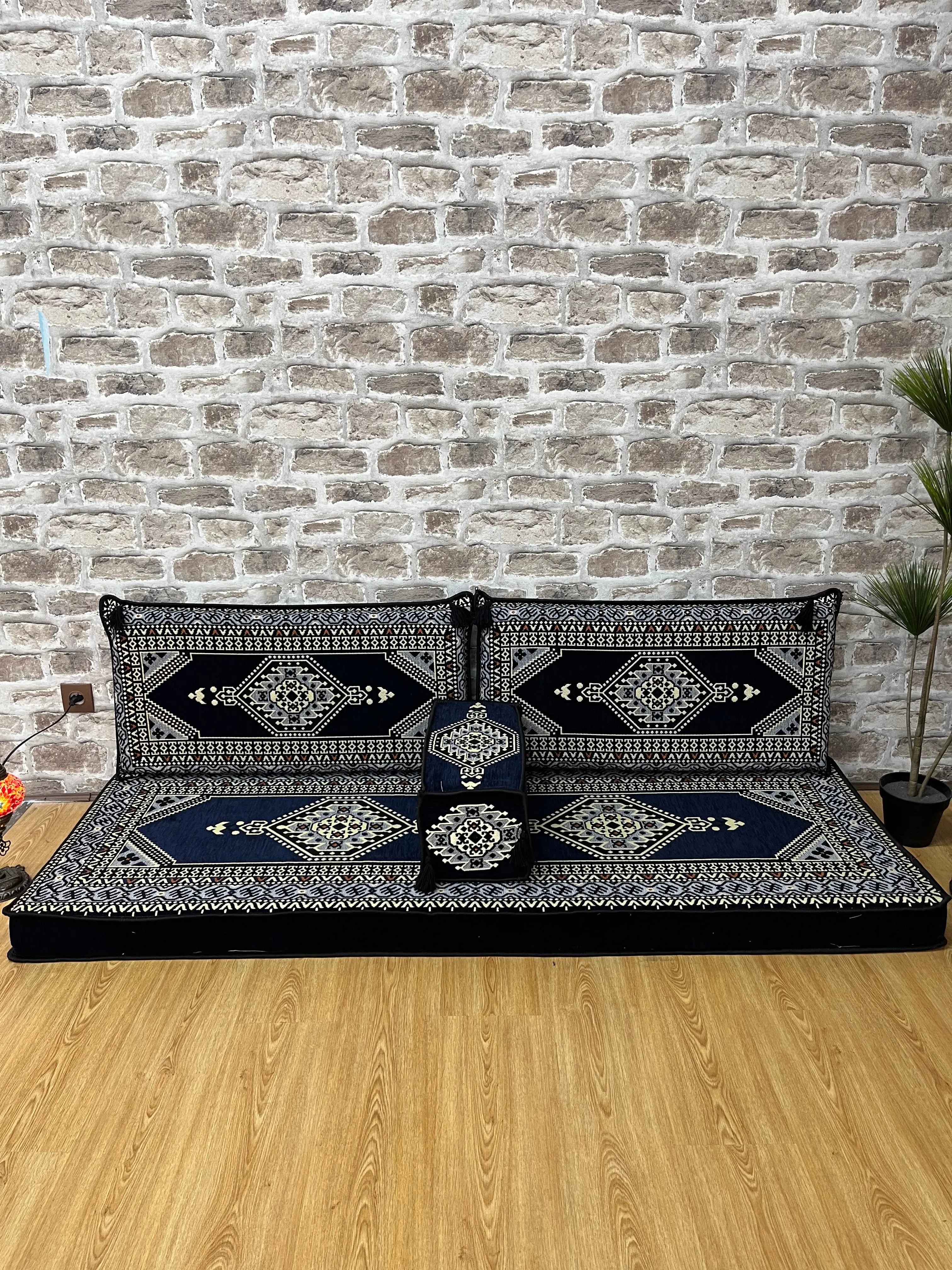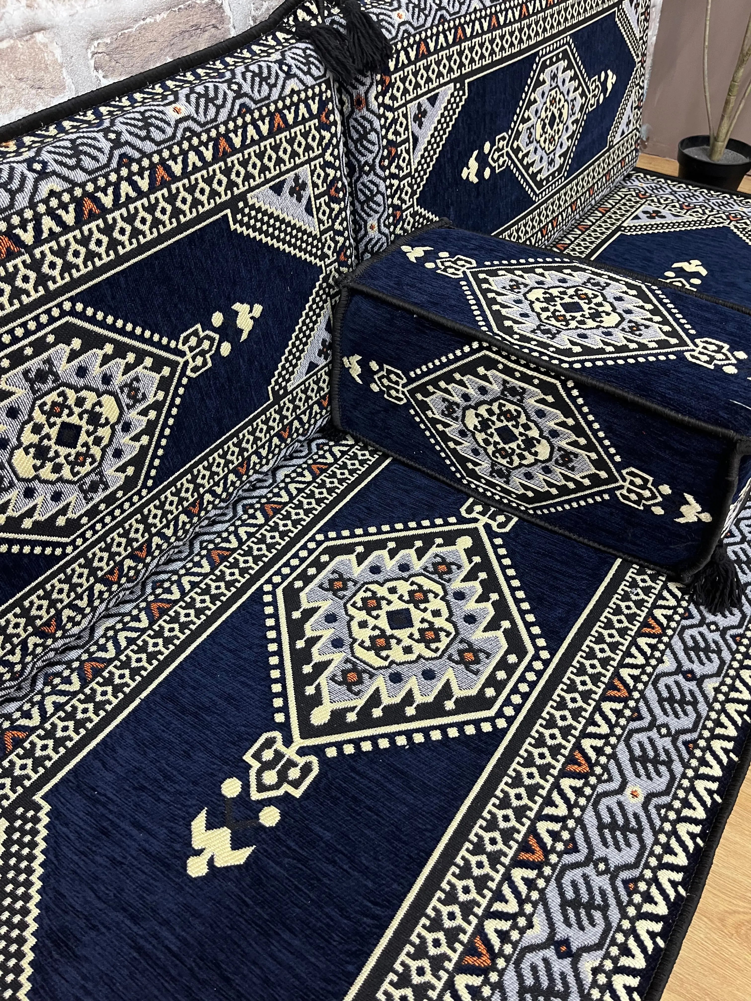 Avec ses motifs géométriques bordeaux et ses finitions soignées, cet ensemble est idéal pour créer un coin salon chaleureux, un espace détente convivial ou un décor oriental moderne.