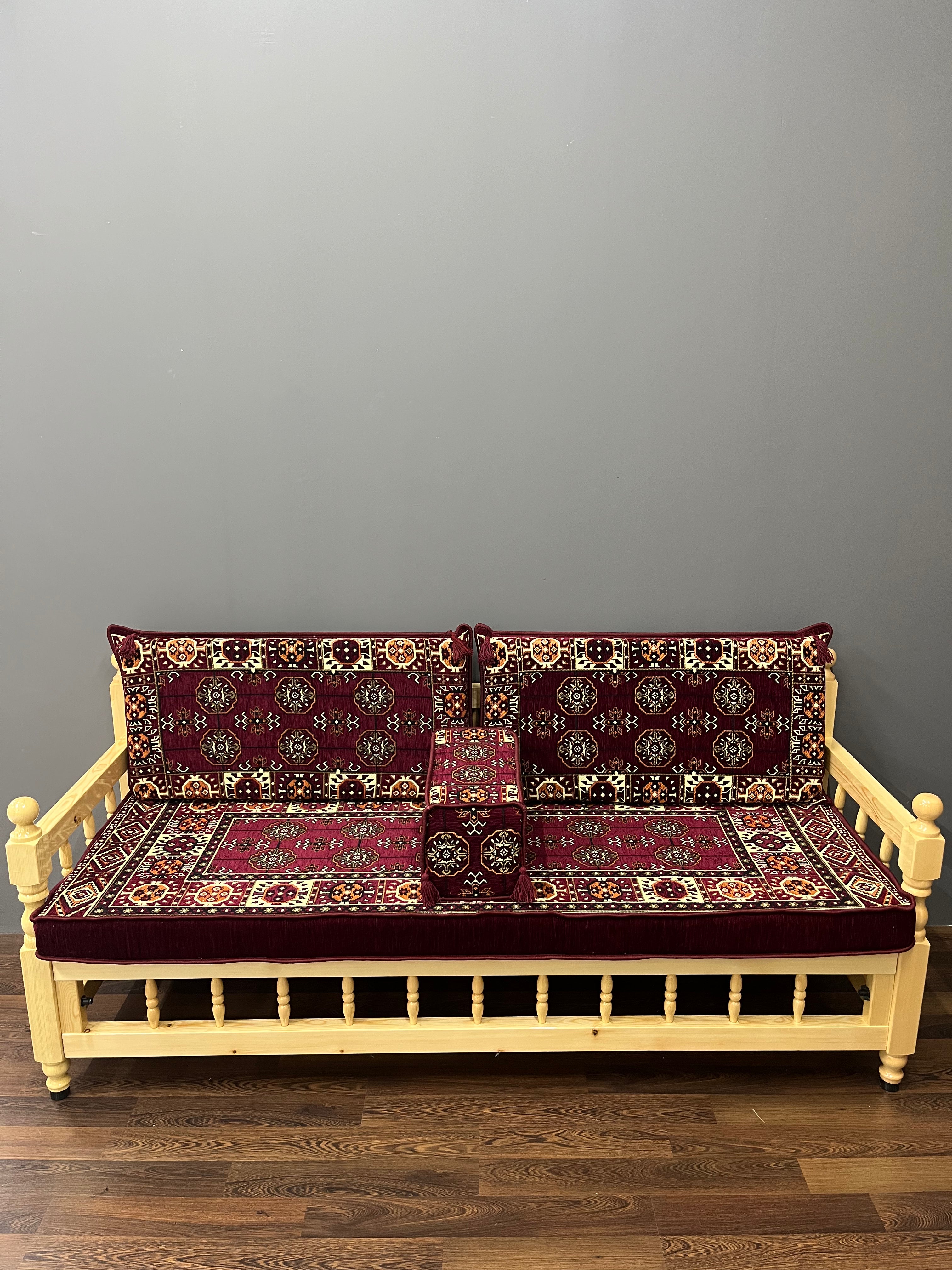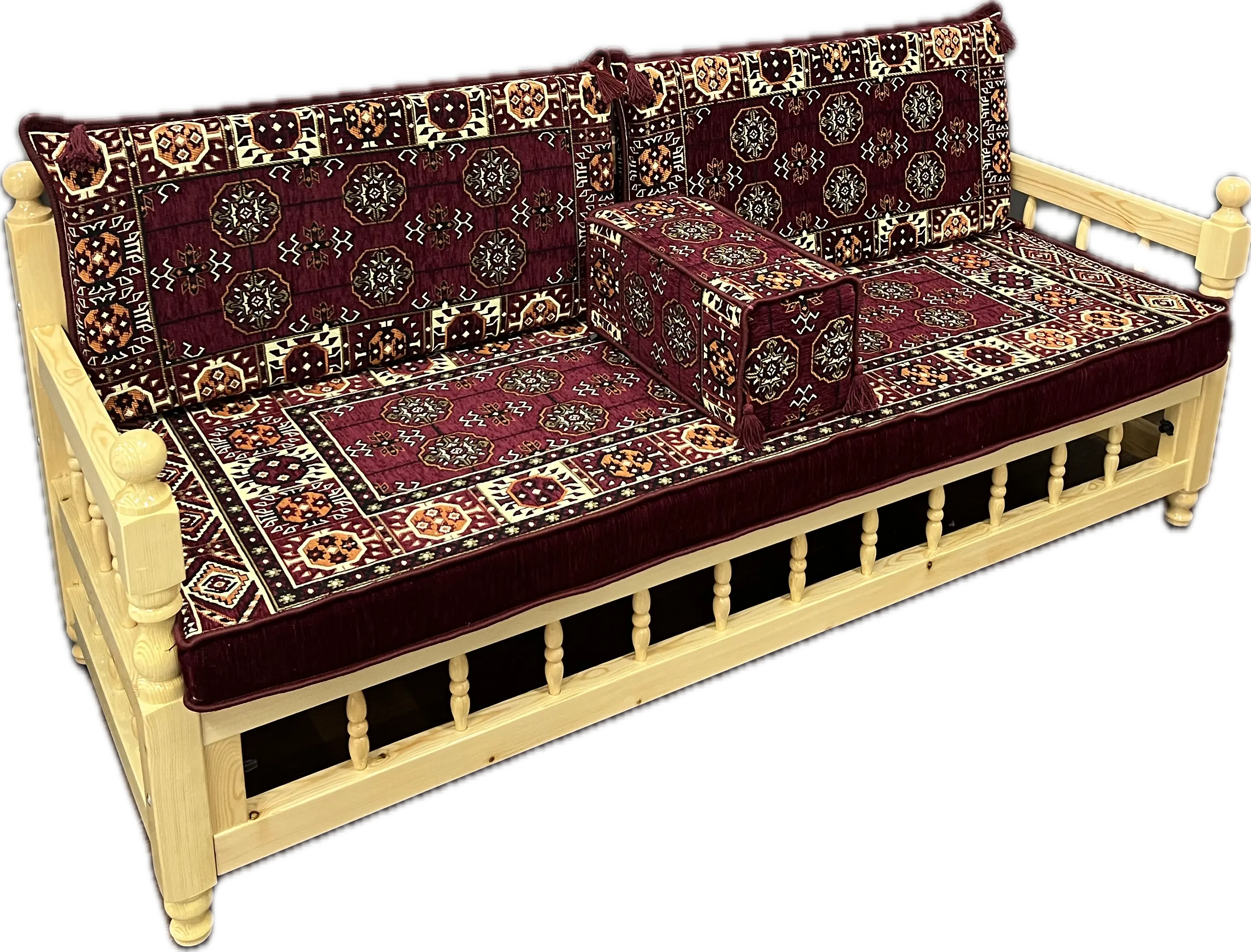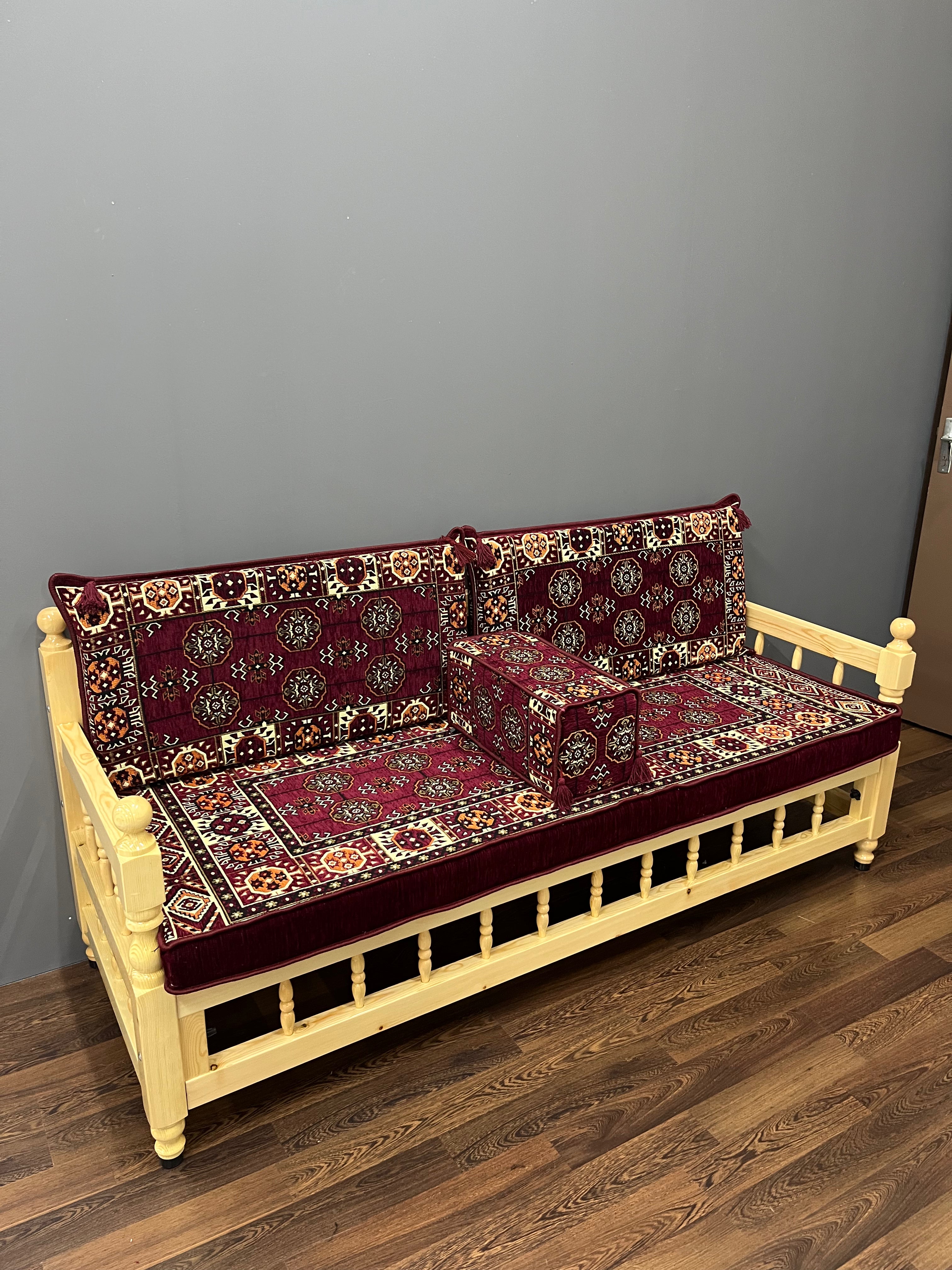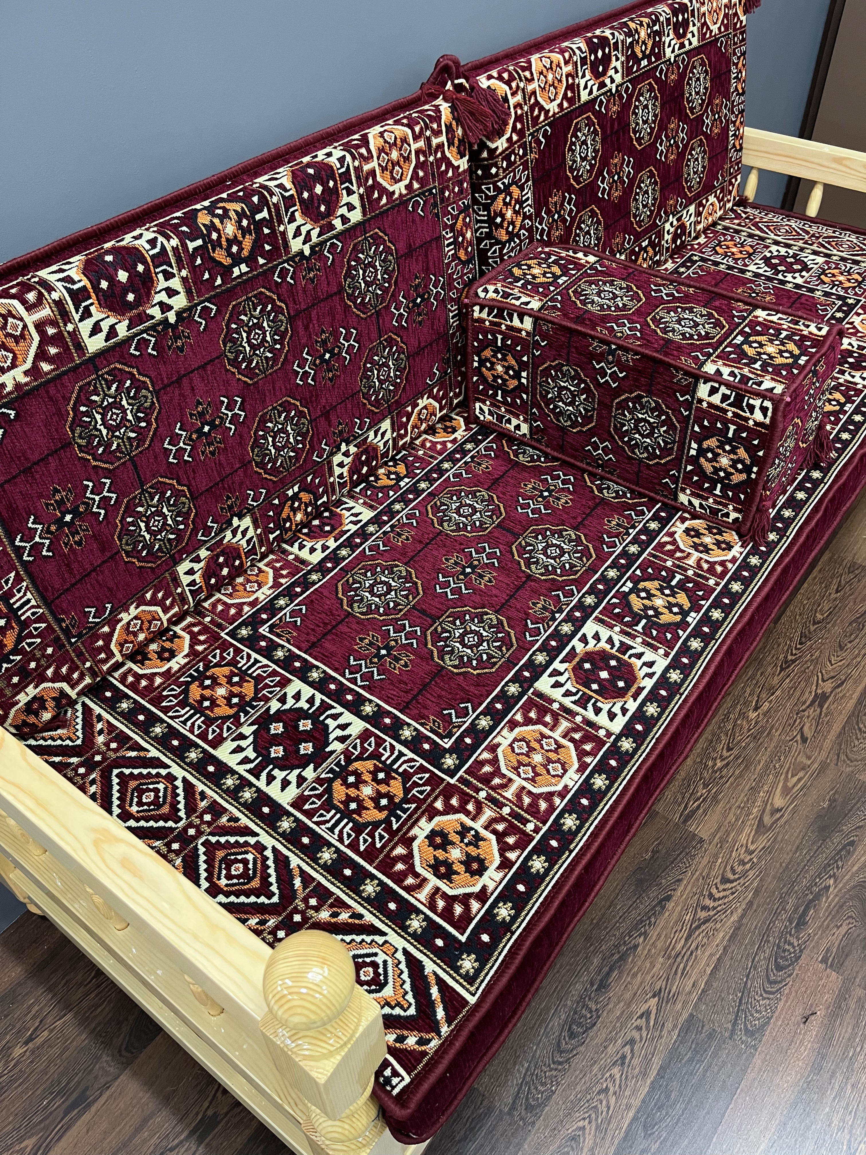 Avec ses motifs géométriques bordeaux et ses finitions soignées, cet ensemble est idéal pour créer un coin salon chaleureux, un espace détente convivial ou un décor oriental moderne.
