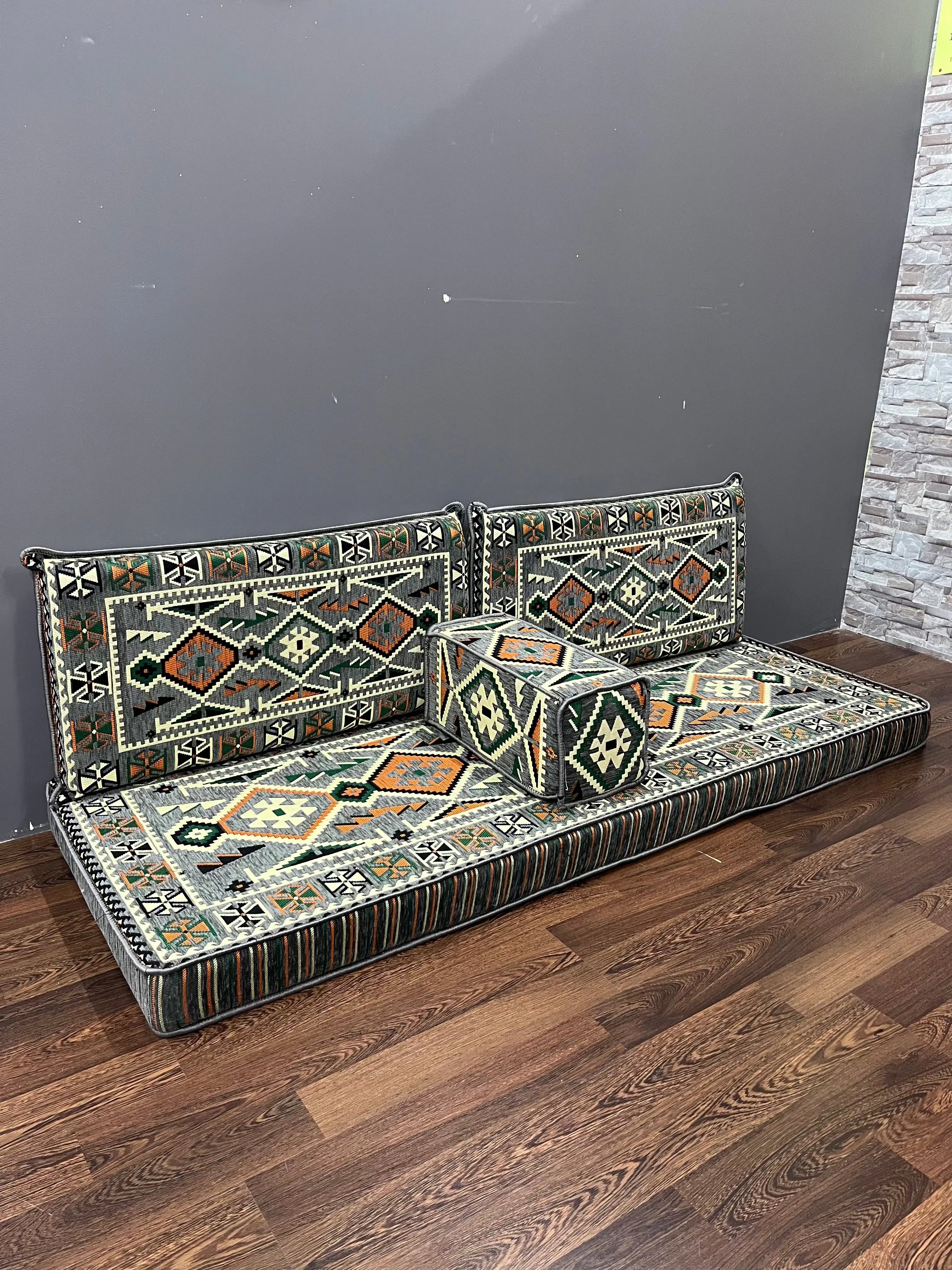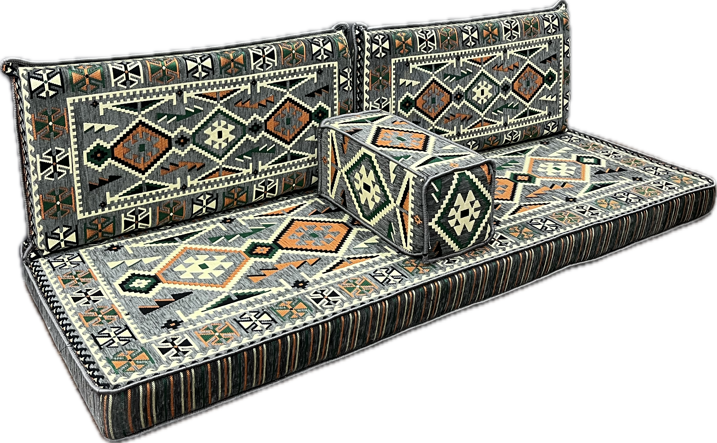 Avec ses motifs géométriques gris et ses finitions soignées, cet ensemble est idéal pour créer un coin salon chaleureux, un espace détente convivial ou un décor oriental moderne.