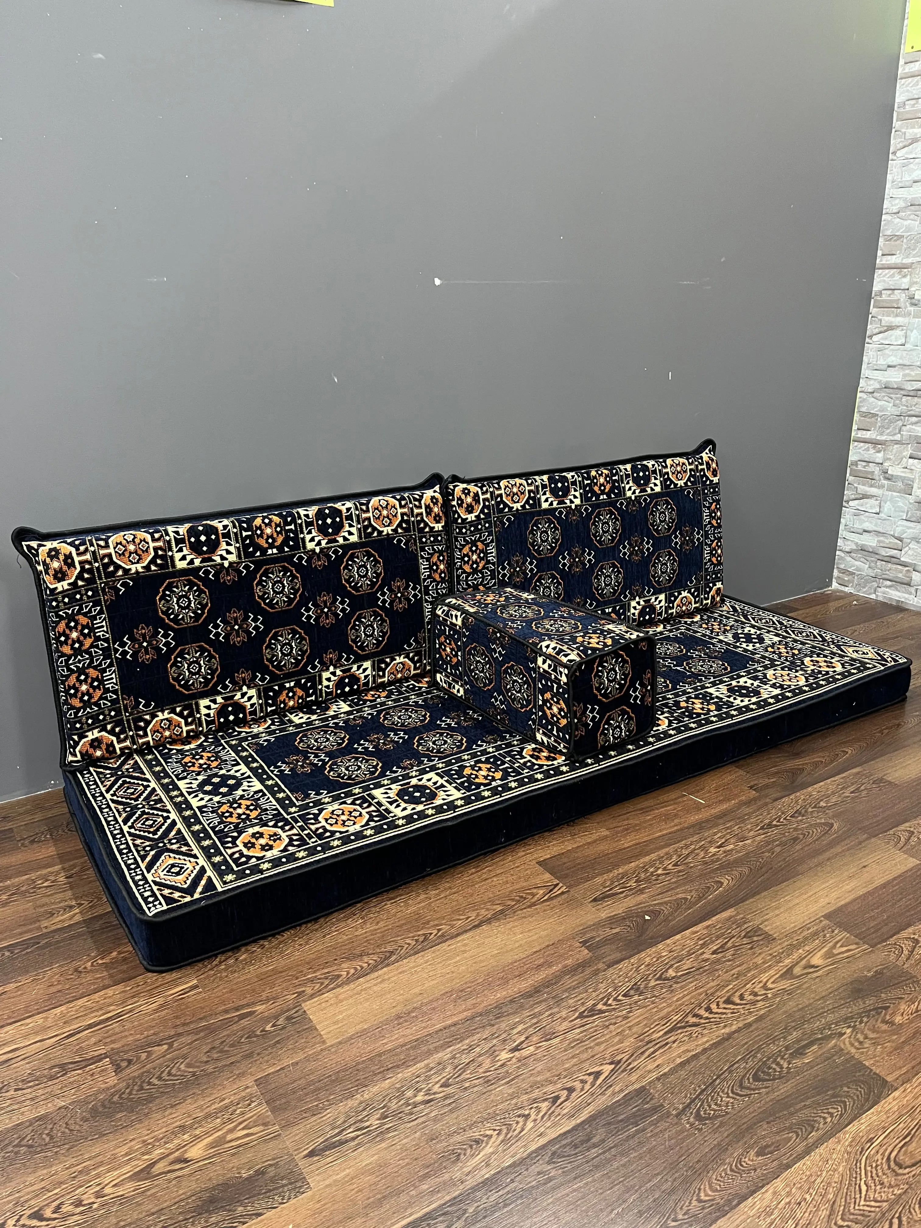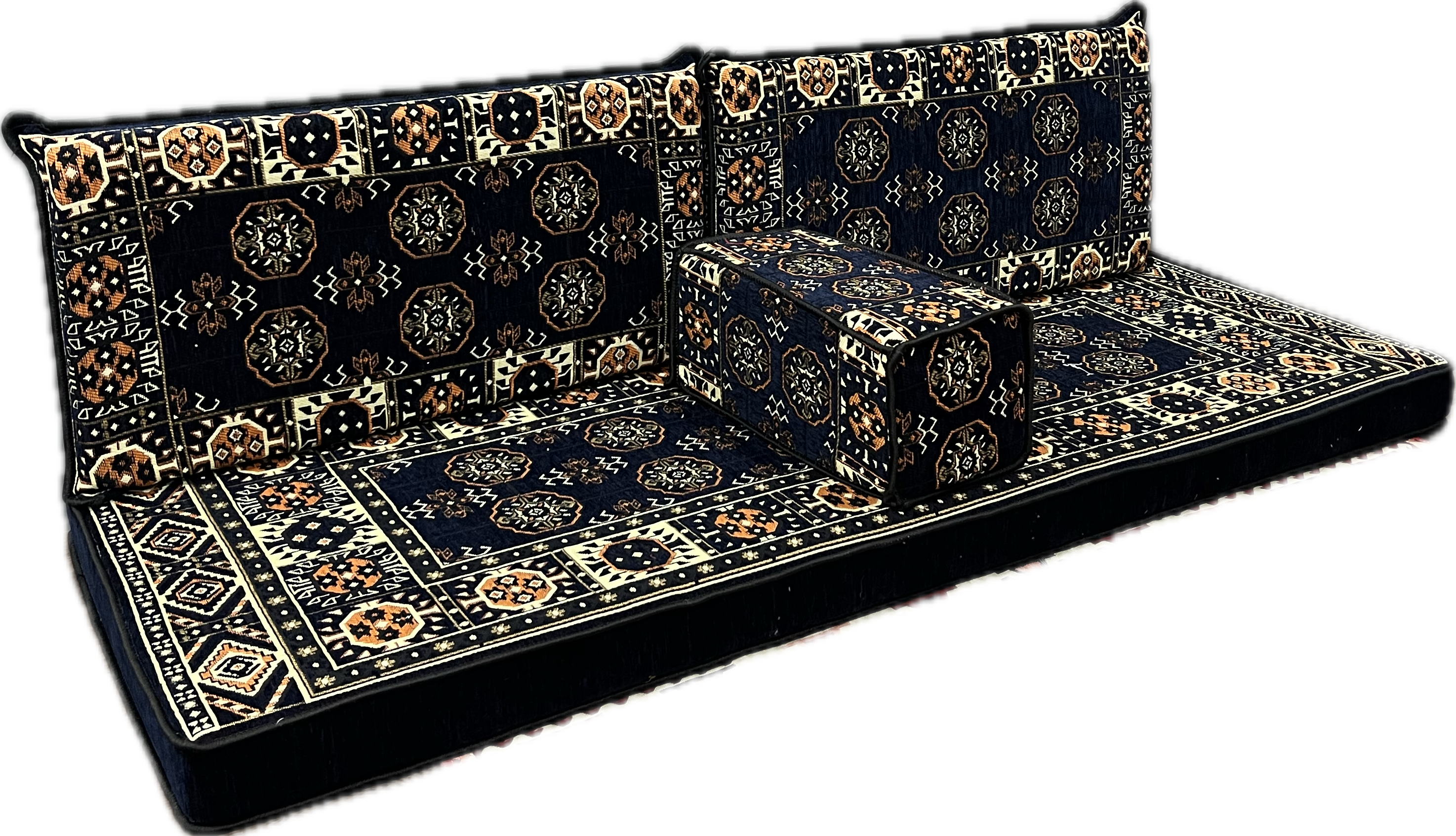 Avec ses motifs géométriques bleue nuit et ses finitions soignées, cet ensemble est idéal pour créer un coin salon chaleureux, un espace détente convivial ou un décor oriental moderne.