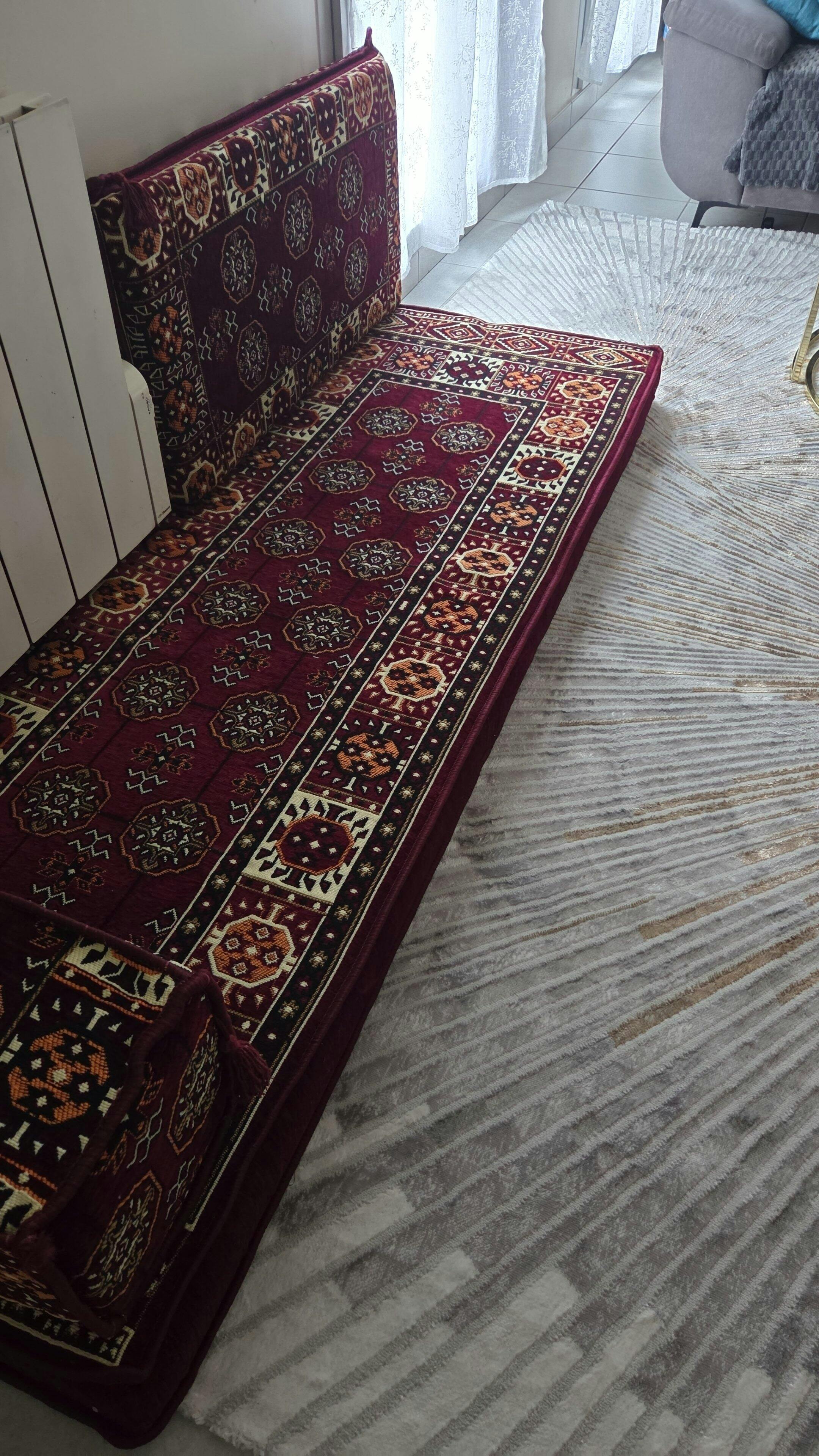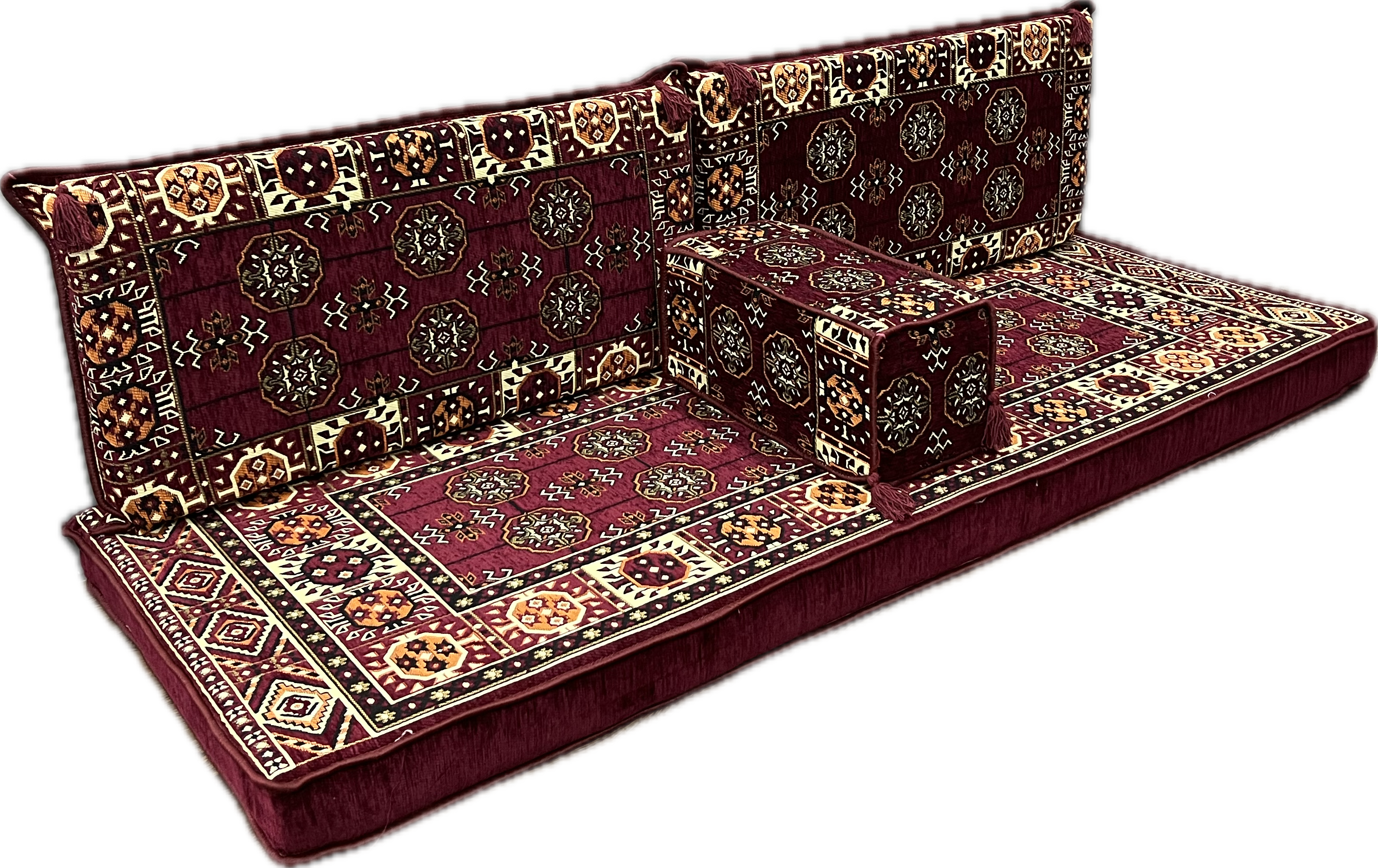 Avec ses motifs géométriques bordeaux et ses finitions soignées, cet ensemble est idéal pour créer un coin salon chaleureux, un espace détente convivial ou un décor oriental moderne.