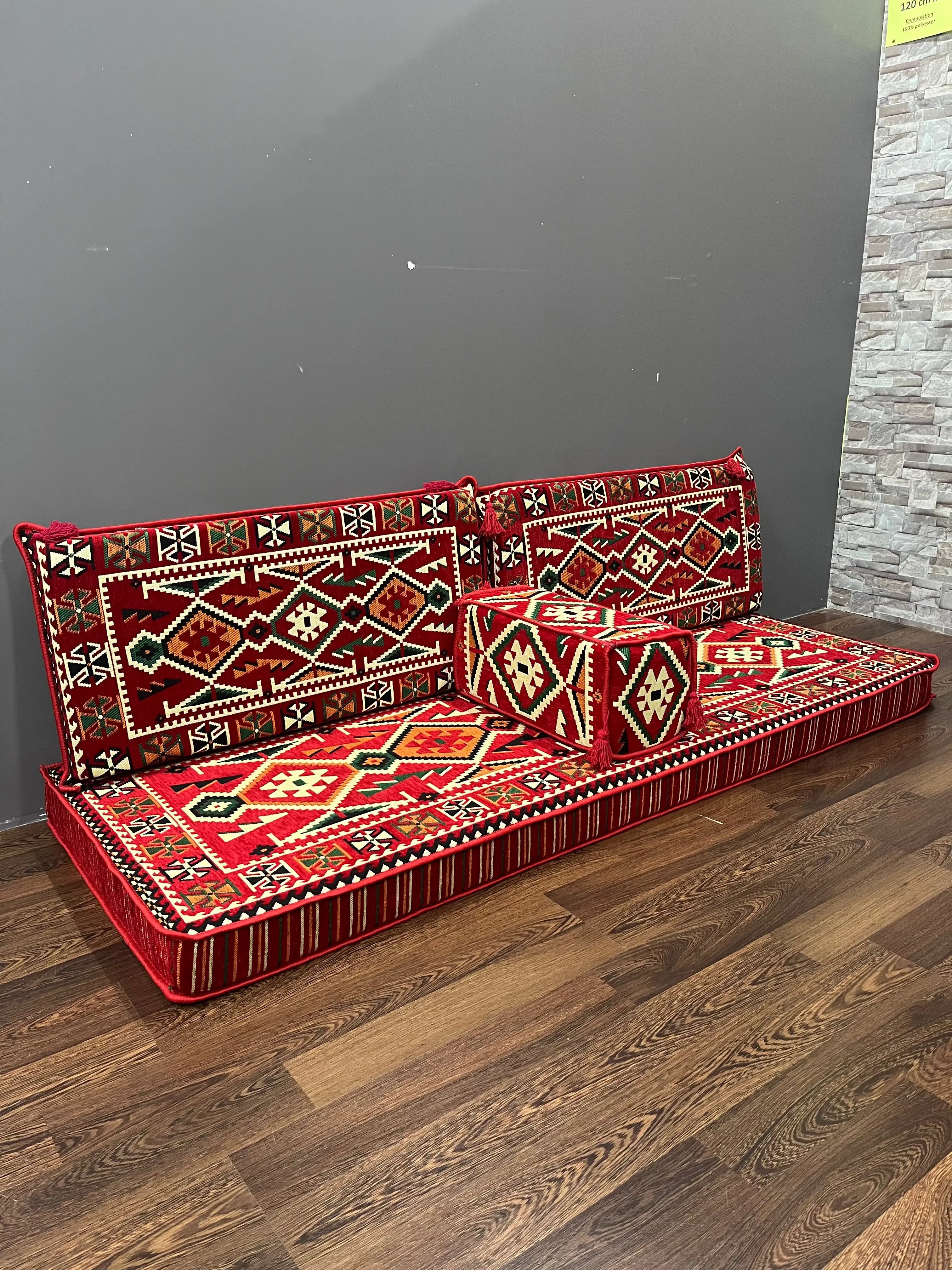Bu otantik tasarımlı oturma odası takımıyla evinize oryantal bir dokunuş katın. Dayanıklı polyester kumaştan üretilen ve kalın köpükle doldurulan bu takım, dinlenmeniz veya eğlenmeniz için zarafet ve konforu bir araya getiriyor.