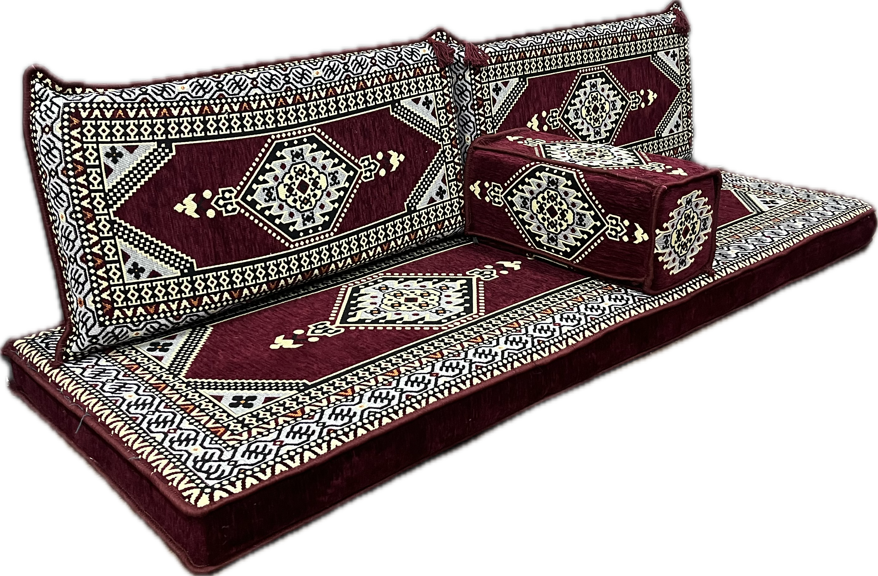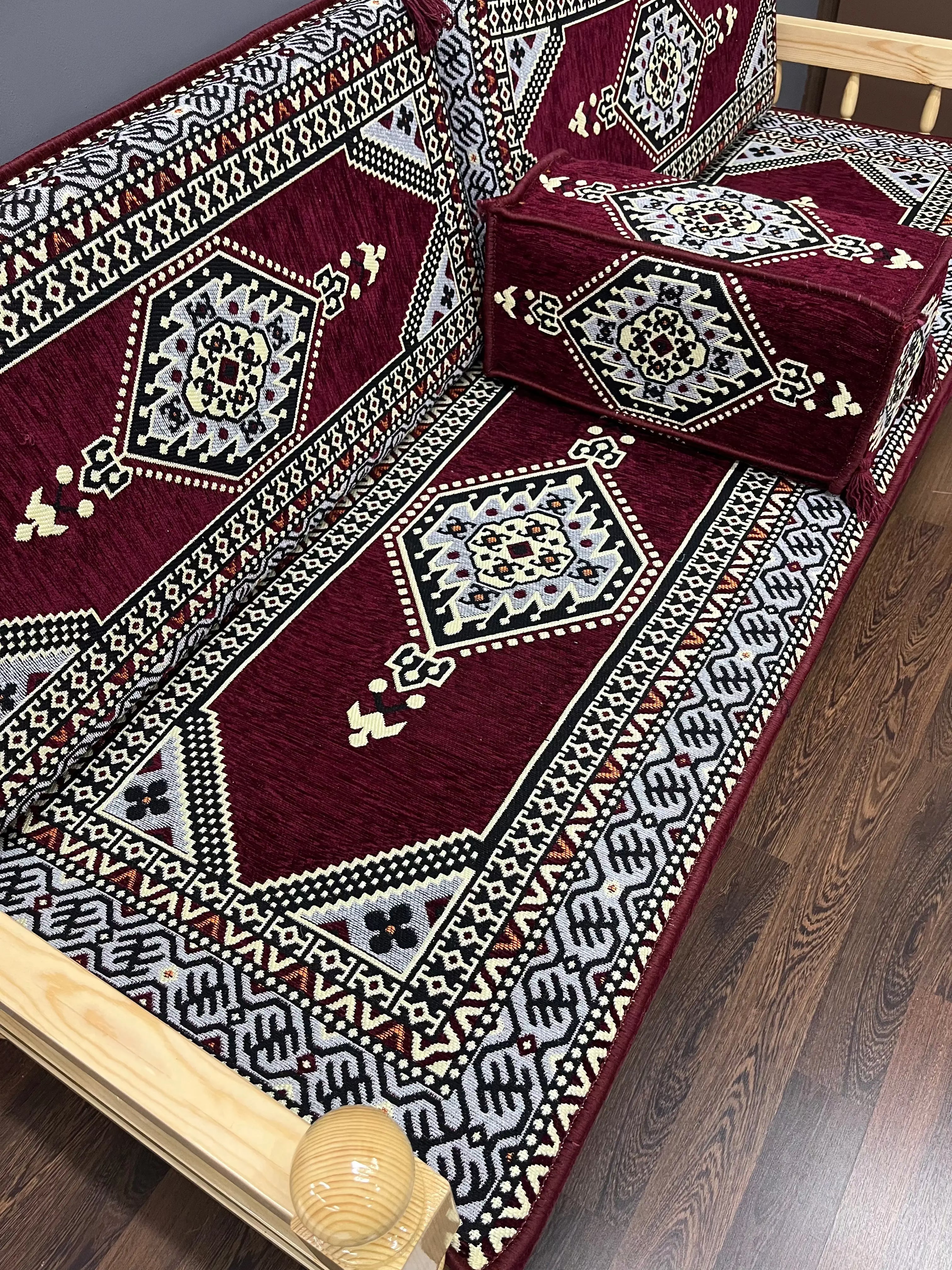 Bordo geometrik desenleri ve sade detaylarıyla bu takım, sıcak bir oturma alanı, samimi bir dinlenme alanı veya modern bir oryantal dekor yaratmak için idealdir.