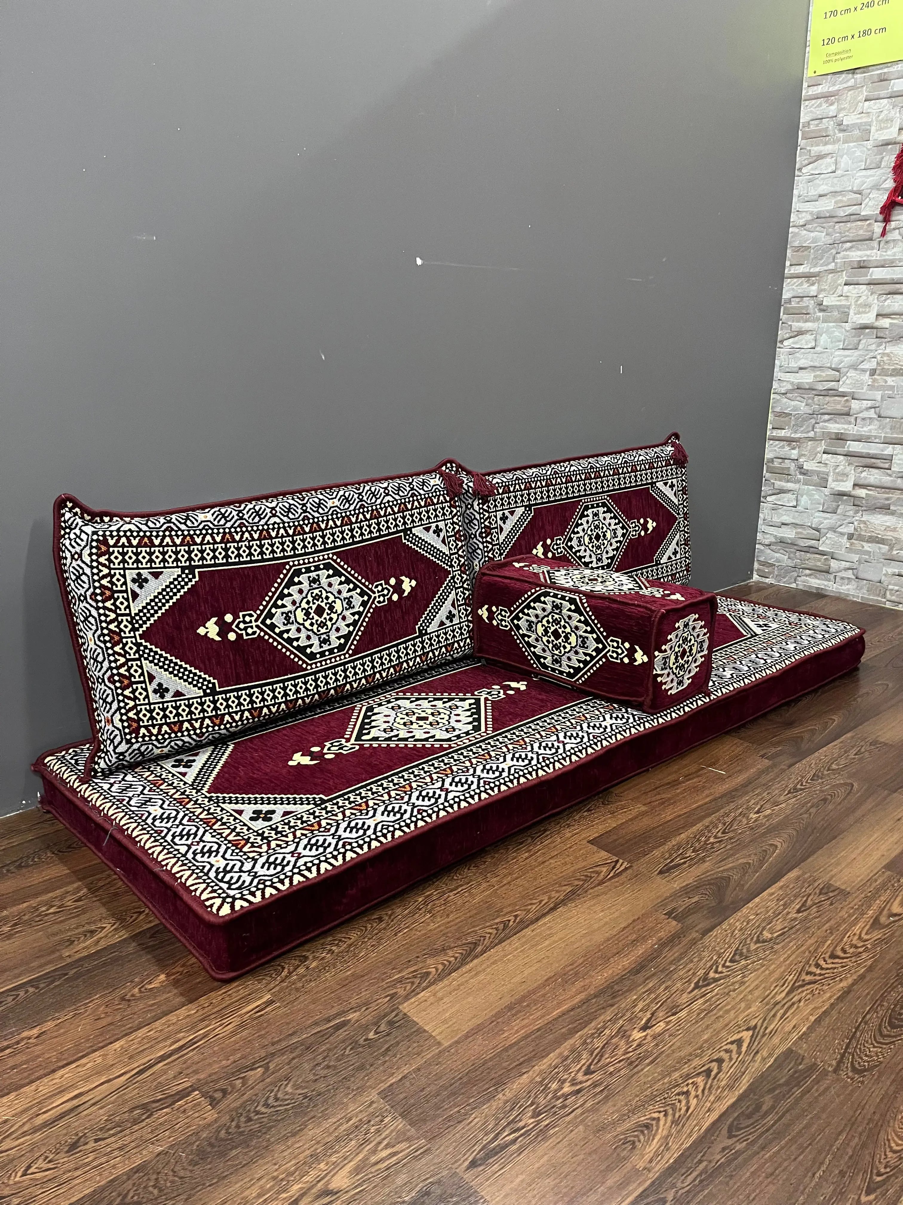 Bu otantik tasarımlı oturma odası takımıyla evinize oryantal bir dokunuş katın. Dayanıklı polyester kumaştan üretilen ve kalın köpükle doldurulan bu takım, dinlenmeniz veya eğlenmeniz için zarafet ve konforu bir araya getiriyor.